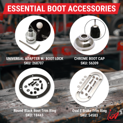 Dress up your shift or emergency brake brake boot with an American Shifter Stainless Steel Trim ring. Each kit includes a precision stamped ring with flush mount screw openings for a smooth look. The kits come with matching hardware including M10 bolts, washers and Nylock nuts.