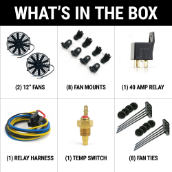 ZIRGO SUPER COOL PACKThis kit contains everything you need to install and control your TWIN Zirgo fans! Ideal for converting from a mechanical fan to enhance horsepower and efficiency. Also works great for oil, condenser, and transmission cooling. Works anywhere you need cooling.