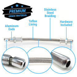 Includes: one pair heavy-duty 3/8 inch inner diameter Teflon-lined stainless steel braided hoses, jam nuts, aluminum hardware, free live USA Tech Support, and a Limited Lifetime Warranty.