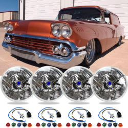 4 Piece Set AutoLöc 5-3/4" Round Tri-Bar Dot Halogen Headlight Headlamp Assembly with Bulbs, Wire Harness Pigtails, and 5 Interchangeable Color Dots for 1958-1959 Chevrolet Sedan Delivery