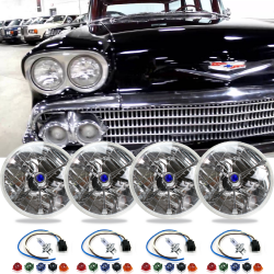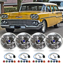 4 Piece Set AutoLöc 5-3/4" Round Tri-Bar Dot Halogen Headlight Headlamp Assembly with Bulbs, Wire Harness Pigtails, and 5 Interchangeable Color Dots for 1958 Chevrolet Yeoman