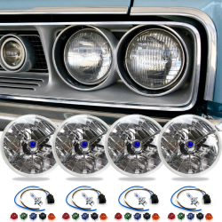 4 Piece 5 3/4" Round Tri-Bar Dot Halogen Headlight Headlamp Assembly Set with Bulbs, Wire Harnesses, and 5 Interchangeable Color Dots for each headlight - Fits 1969-1973 Dodge Polara