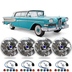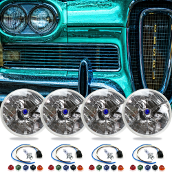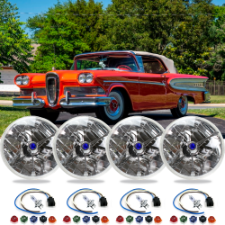 4 Piece 5 3/4" Round Tri-Bar Dot Halogen Headlight Headlamp Assembly Set with Bulbs, Wire Harnesses, and 5 Interchangeable Color Dots for each headlight - Fits 1958 Edsel Citation