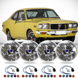 4 PC Set 5-3/4" Round Tri-Bar HB2 H4 Car Headlight Conversion Kit Compatible with / Replacement for 1972-1975 Mazda 808 w/ Bulbs Plugs & 5 Interchangeable Color Dots Amber Black Blue Green & Red