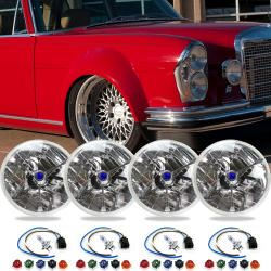 4 Piece Set AutoLöc 5-3/4" Round Tri-Bar Dot Halogen Headlight Headlamp Assembly with Bulbs, Wire Harness Pigtails, and 5 Interchangeable Color Dots for 1969-1972 Mercedes-Benz 280SEL