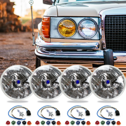 4 Piece Set AutoLöc 5-3/4" Round Tri-Bar Dot Halogen Headlight Headlamp Assembly with Bulbs, Wire Harness Pigtails, and 5 Interchangeable Color Dots for 1973-1976 Mercedes-Benz 450SE