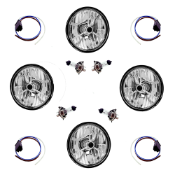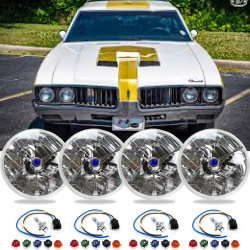 4 Piece Set AutoLöc 5-3/4" Round Tri-Bar Dot Halogen Headlight Headlamp Assembly with Bulbs, Wire Harness Pigtails, and 5 Interchangeable Color Dots for 1964-1973 Oldsmobile Vista Cruiser