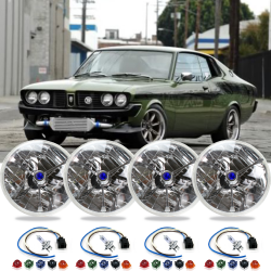 4 Piece Set AutoLöc 5-3/4" Round Tri-Bar Dot Halogen Headlight Headlamp Conversion Assembly Kit with Bulbs, Headlight Plugs, and Interchangeable Color Dots for 1972-1976 Toyota Mark II