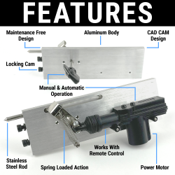 Designed with CNC machined 6061 aircraft aluminum, and a heavy duty stainless steel locking rod. Heavy duty construction and a unique locking cam design guarantees a long life of smooth operation. Set comes complete with 12V power lock actuator motors and all the necessary hardware. Add one of AutoLöc's 4, 5, 6, or 8 channel keyless entries to operate by remote control. (Sold separately)