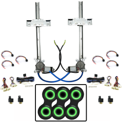 2 Door Flat Glass Electric Power Window Conversion Kit w/ 3 Retro Style Green Illuminated Lighted Black Billet Aluminum Switches 12V High Torque Motors for Older Classic Car Truck Hot Rod Street Rod