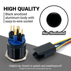 These switches are commonly used for automotive, marine, and industrial applications. They are also waterproof (IP66), making them ideal for both exterior or interior mounting on cars, trucks, or boats. Endless possibilities! Use to operate power windows, door locks, engine start, sunroofs, electric motors, linear actuators, tonneau covers, headlights, horns, RV / camper van panels, and much much more!