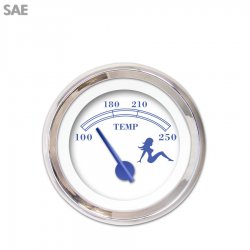 Water Temp Gauge - SAE Mudflap Blue Text, White, Blue Modern Needles, Chrome Trim Rings ~ Style Kit Installed
