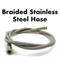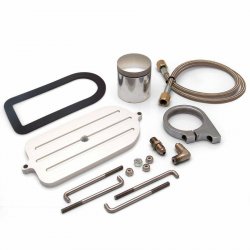Kit includes alloy brake reservoir cap and hose for Big Ford master cylinder, brake fluid reservoir, bracket and 1/4" SAE flare plug fitting.
