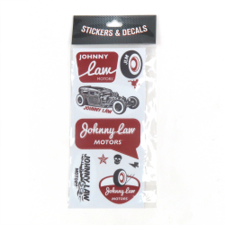 Johnny Law Motors exclusive logo sticker pack includes 10 custom stickers. Show your love for hot rods and Johnny Law Motors with this one-of-a-kind sticker pack.