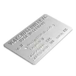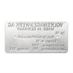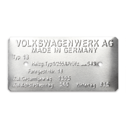 Data Plate missing or Damaged? This anodized aluminum "Made in Germany" Vin / Data plate with metallic finish is the perfect replacement for any vehicle. Comes in Aluminum silver finish and is made to exact specifications for your application. These Aluminum Vin / Data plates come with all the same original information as found on your original Made in Germany vehicle.