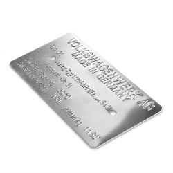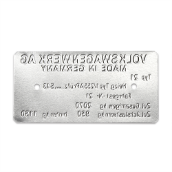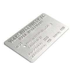 Data Plate missing or Damaged? This anodized aluminum "Made in Germany" Vin / Data plate with metallic finish is the perfect replacement for any vehicle. Comes in Aluminum silver finish and is made to exact specifications for your application. These Aluminum Vin / Data plates come with all the same original information as found on your original Made in Germany vehicle.