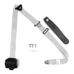 This kit includes two white retractable 3-point belts, one white center lap 2-point belt, angled mounting hardware, and three grey seat extenders.