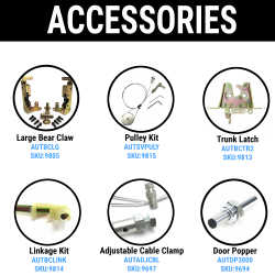 Trim plate can be installed both vertically or horizontally. Kit is sold in pairs for both left and right installation. Hardware included. Release mechanism mounts directly to your vehicle latch. Add AutoLoc's Cable Extension Kit or Pulley Cable Extension Kit to connect the knobs to your latch.