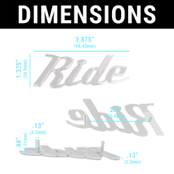 Die Cast Chrome Metal "Ride" Script Custom Lettering Car Truck Fender Emblem Trunk Hatch Tailgate Grille Badge Ornament w/ Easy Mounting Posts for Hot Rod Street Rod Minitruck SUV Van - Combine Words!