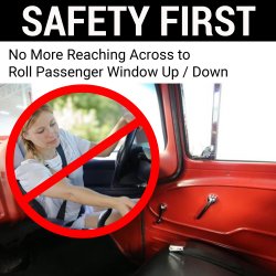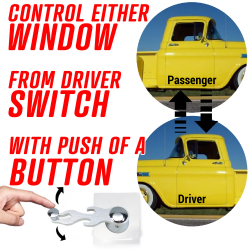 No more reaching across the seats! Enjoy the ease and convenience of being able to operate 2 windows from one switch. Use your driver window crank handle lever to control driver or passenger window. Use the push button to alternate power to whichever window you wish to control.