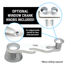 Levers include optional use knobs. The optional knobs are made to fit the tip of the handle. See additional images for reference. AutoLöc door handle levers can be used both as a door handle lever or as a window crank handle, with or without the knobs. To mount the knobs on the lever simply use the pre-aligned guide started on the back of the lever. Includes allen wrench and screws. Minor drilling required.