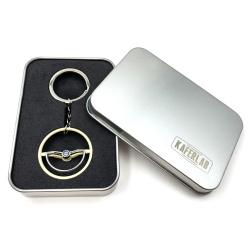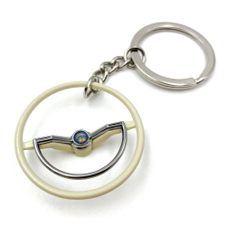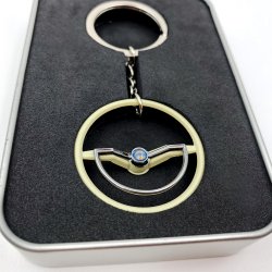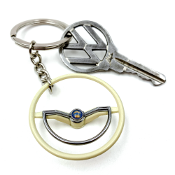 A perfect 1960-63 VW Beetle Dished steering wheel keychain! These keychains are perfect replica of the VW aircooled 1960-63 VW Beetle Dished steering wheels from back in the day. Each Volkswagen steering wheel keychain offers identical scale details just like the factory Volkswagen steering wheel. Precision cast from alloy and then hand painted and assembled with a high quality chrome keychain & ring. You can customize your keychain by installing one of the 9 interchange horn button decals. These VW keychains are available in factory Beige, Black, and limited edition chrome. Makes the perfect gift for your Volkswagen aircooled fan!