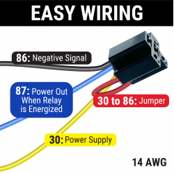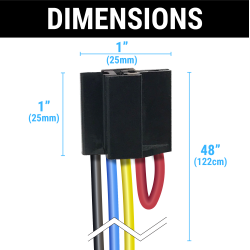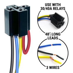 AutoLöc's 48” extra long relay socket harness plug gives you the extra wire you need for a quick and clean installation. No more need to splice wires! Find the perfect location to mount your relay. Heavy gauge wire. Up to 30 amps rush and 20 amps continuous power. Perfect for most 12 Volt DC accessories that do not need a normally closed (NC) circuit.