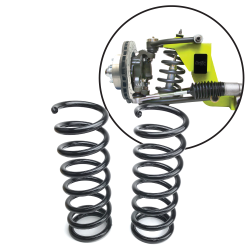 Our custom designed coil springs feature a conical design. The narrow end rides in the lower coil bracket while the top flares and fits into the M-II spring top hat.