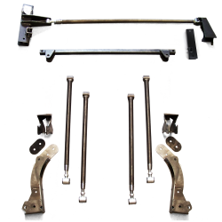 Each 4-Link kit includes all custom bolt on brackets, oversized stainless steel adjusters, full upper coilover crossmember, panhard bar, 1" OD tubing oversized 4-link bars, axle brackets, bolt on chassis bracket, and detailed instructions.